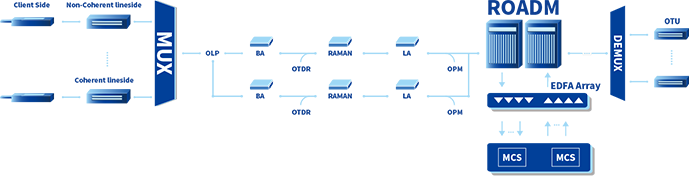 By higher bitrate and more available wavelengths, Dense Wavelength Division Multiplexing (DWDM) is the most effective method to increase transmission capacity. Accelink can provide end-to-end DWDM device with almost all optical devices - from active modules to optical passive devices, including optical amplifier(EDFA & RFA), Mux & Demux, OPM, ROADM, MCS, OLP and OTDR etc.