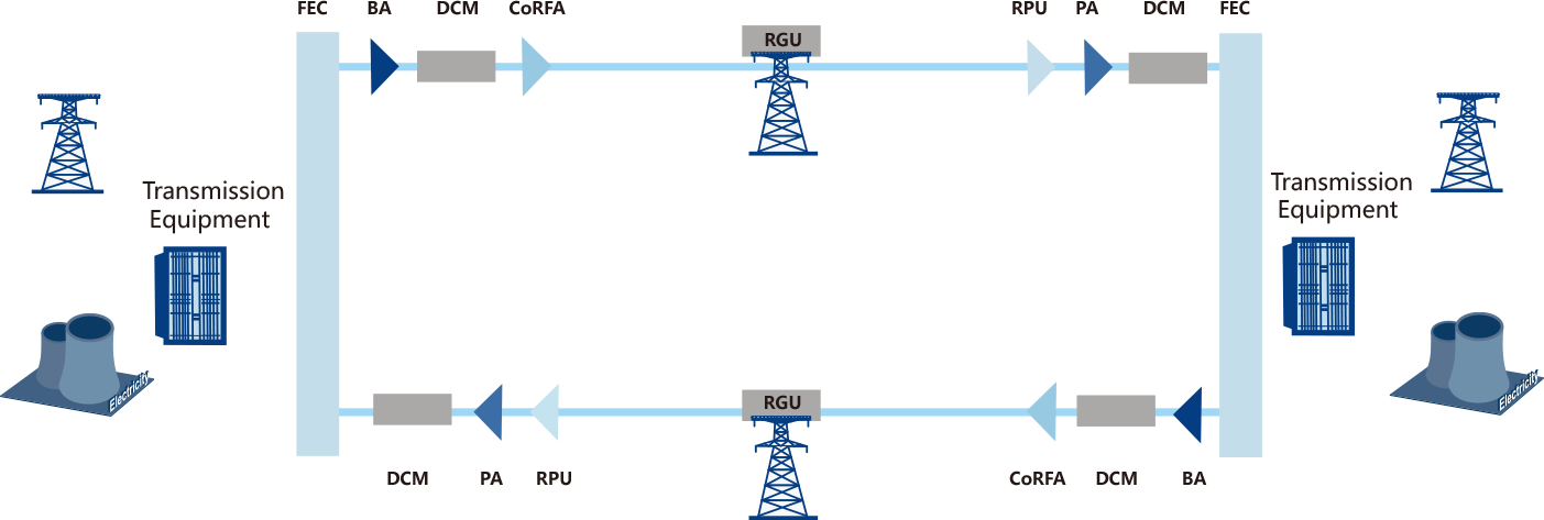 For ultra-long-haul optical fiber communication system, the traditional communication mode is to set up a relay station in the line, in which the optical signal is amplified and shaped before transmission. However, the transmission line route of the industry private network, especially the power system, is usually remote, passing through harsh areas such as desert and mountain range, it is difficult to find a suitable optical relay station. In addition, the construction of independent optical relay station along the line also needs to build new infrastructure (including civil engineering, electrical engineering, fire protection, HVAC, etc.), which will be affected by many factors such as site selection, land acquisition, external power supply, construction conditions, etc. during the construction, and after put into operation, any failure in the power environment of the machine room, external power supply, incoming optical cable, optical transmission equipment and others will also affect the reliability of communication circuit. The ultra-long haul optical transmission technology has the characteristics of end-to-end direct access, no relay equipment, low operation and maintenance cost and so on. The optical subsystem products of Accelink use ultra-long-haul optical transmission technology to effectively realize long-distance direct communication, reduce the relay station faults, and improve the stability and safety of line operation.